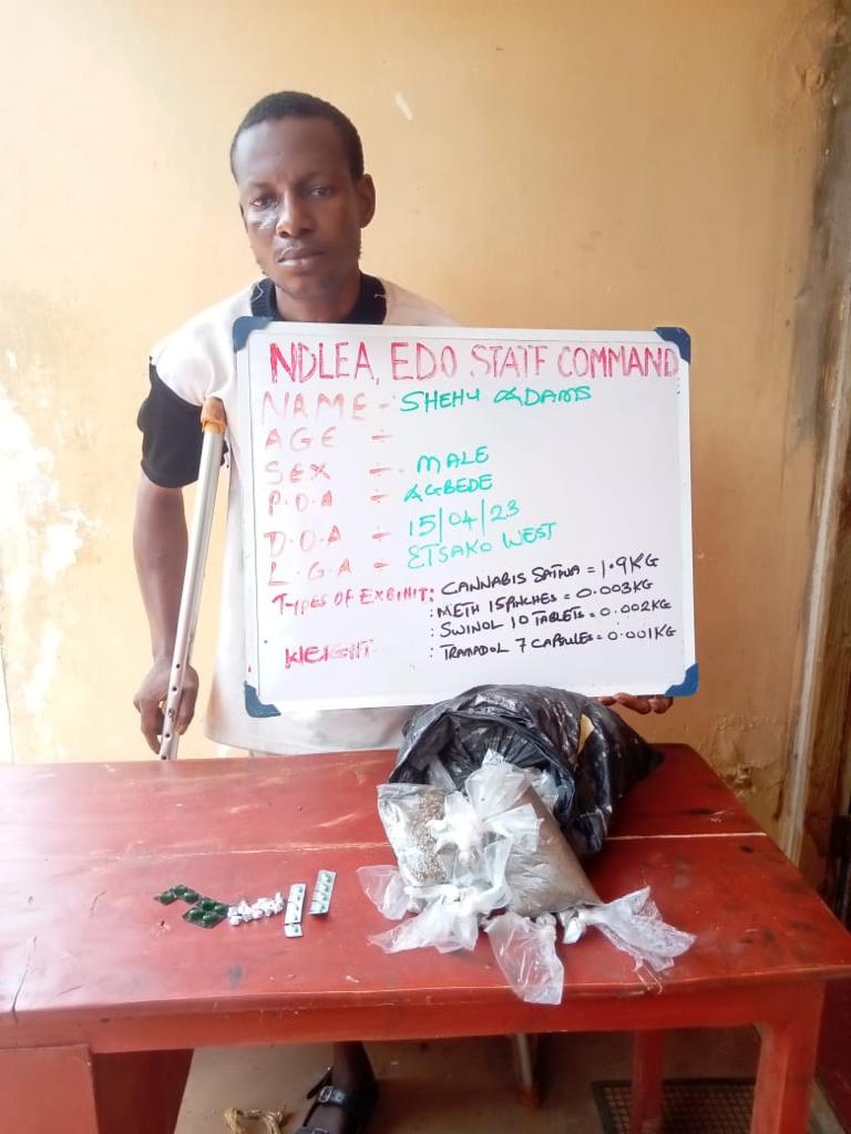 Meanwhile, a pregnant woman, Rabetu Abdulrasak, 24, and a cripple, Shehu Adams have been arrested by NDLEA operatives in Agbede, Etsako West LGA, Edo state while over 14 kilograms of assorted illicit drugs including cannabis, methamphetamine, tramadol and swinol were recovered from them on Saturday 15th April.