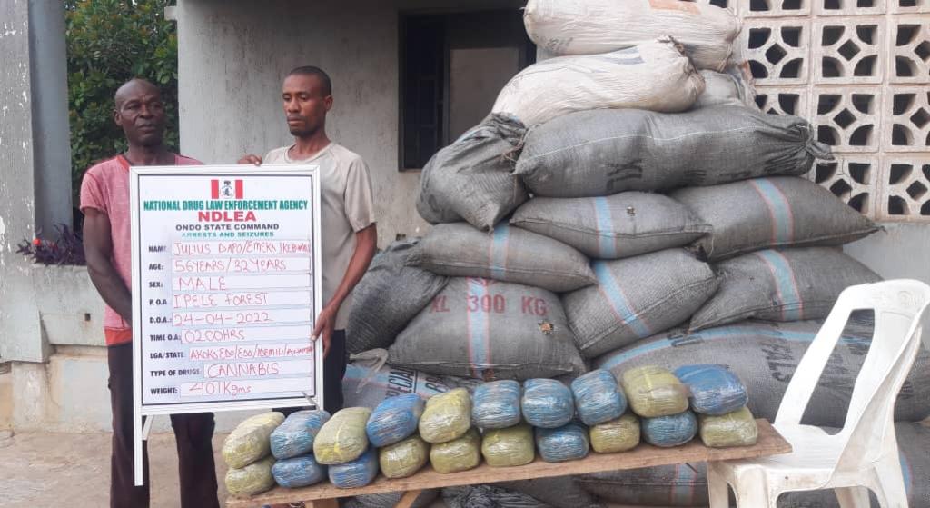 Meanwhile, raid operations in Kaduna, Ondo and Akwa Ibom state have led to the seizure of about 2,000kg of Tramadol, Codeine, Cannabis and Heroin. In Ondo state, 401kg of cannabis was recovered and two suspects: Julius Dapo, 56 and Emeka Ikebuaku, 32, were arrested at Ipele forest in Owo area on Sunday 24th April.