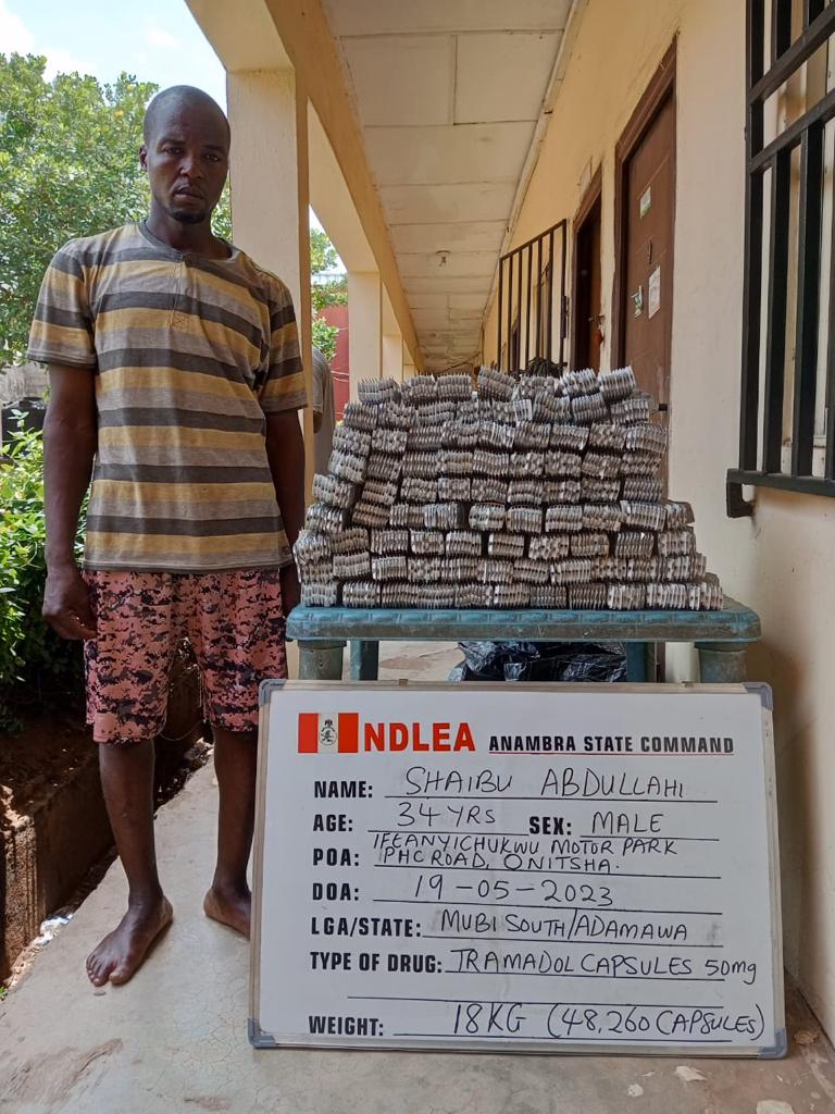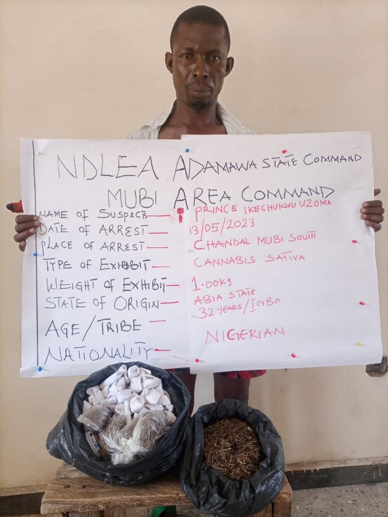 Meanwhile, NDLEA operatives in Adamawa on Monday 15th May arrested a 32-year-old notorious drug dealer, Prince Ikechukwu Uzoma, in Mubi area of the state with 1kg of skunk. Ikechukwu had twice been arrested in the past, and convicted for the same offence. He was in 2017 sentenced to six months imprisonment and in 2019 he was again sent to two years in jail. In the same vein, a trans-border trafficker, Faisal Mohammed, 27, was on Wednesday 17th May arrested in Mubi following the interception of a truck from Onitsha, Anambra State, where a total of 2,376 sachets of tramadol comprising 23,760 pills were found concealed in three blue rubber Jerrycans which were hidden underneath the body part of the trailer. The suspect admitted the opioid was to be taken to Cameroon.