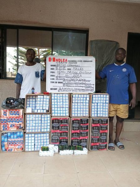 In the FCT Abuja, NDLEA operatives on Monday 18th December intercepted a waybill consignment of 25,000 pills of tramadol, while their counterparts in Anambra arrested two suspects at Onitsha head bridge. Ejiro Emmanuel was driving a bus marked EFR 31 XB conveying 61,100 tramadol capsules; 1, 025 bottles of codeine; 1,350 tablets of rohypnol and 46grams of designer drug, while Daniel Ogbiyoyo was caught in a bus marked SAP 540 YK conveying 55,950 tramadol capsules; 3,117 bottles of codeine; 1,530 tablets of swinol and 1,350 tablets of rohypnol.