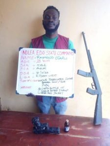 In Edo state, five persons dressed in NDLEA operational jackets were arrested with a fabricated gun and pistol carved from wood following intelligence that they were impersonating as officers of the Agency and conducting illegal operations.