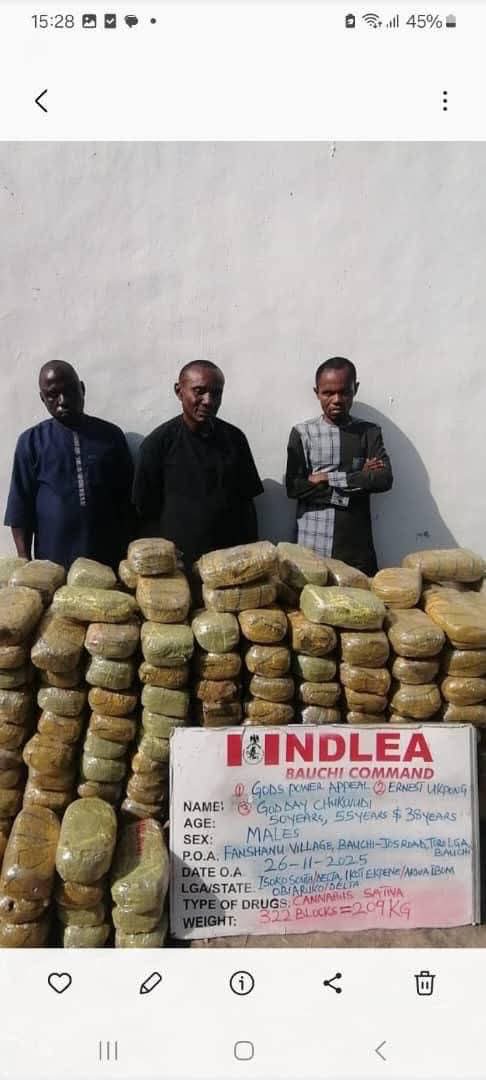 Godspower Appeal, 50; Ernest Upong, 55; and Godday Chukwudi, 38, arrested on Wednesday, 26 November with 322 blocks of skunk (209kg) in Fanshanu village, Toro LGA, Bauchi State. A black Toyota Highlander (ABJ 533 EA) used for transport was seized.