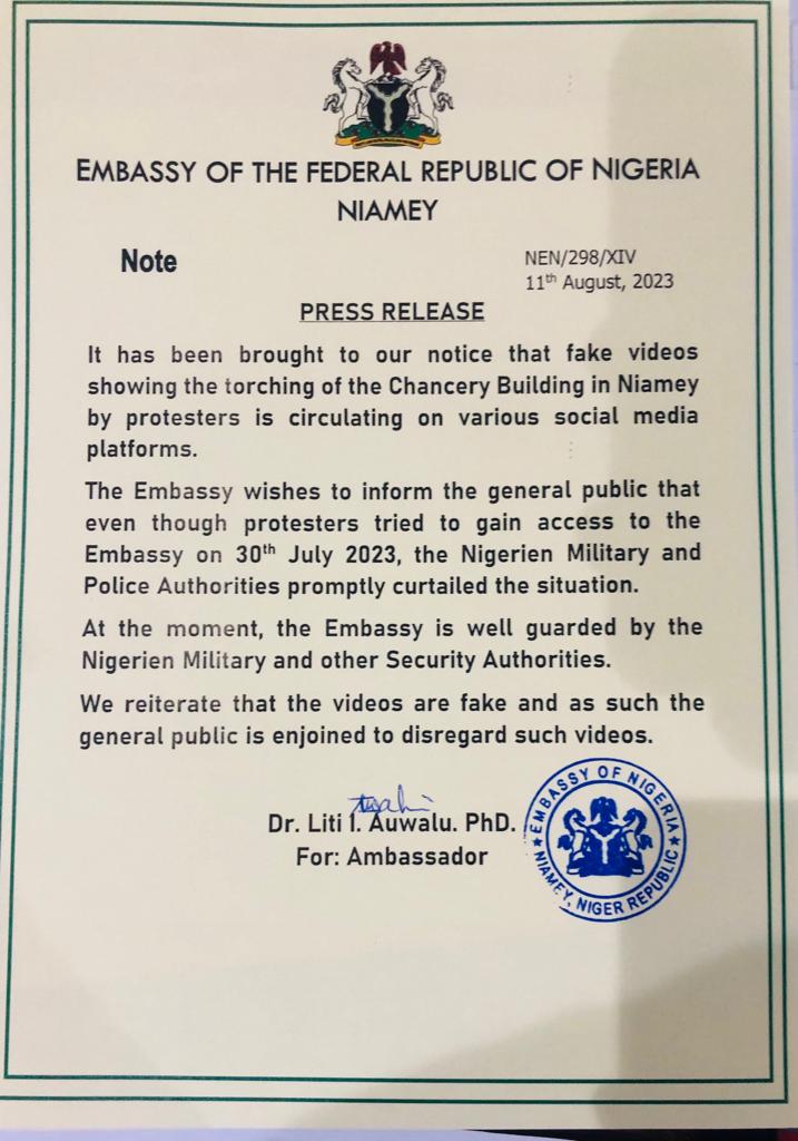 The embassy said in a statement issued on behalf of the Nigerian ambassador to Niger, Mohammed Sani Usman, by Dr. Liti I. Auwalu on Friday August 11, 2023, that the video is fake despite the fact that the protesters tried to gain access to the embassy on July 30, 2023.