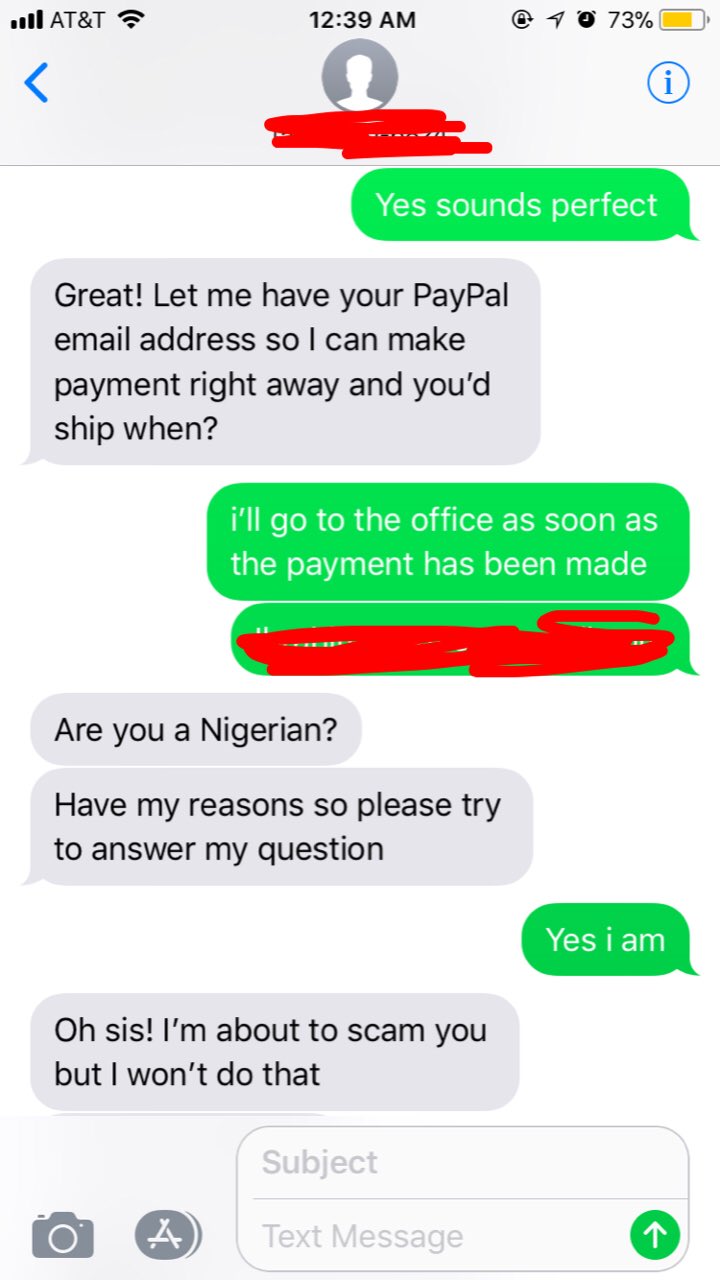 Screenshots of an iMessage conversation between a Nigerian Scammer and an unsuspecting victim are currently trending.