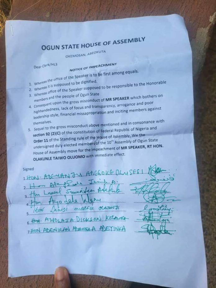 Speaker of the Ogun State House of Assembly, Olakunle Oluomo (APC-Ifo1), has been impeached.