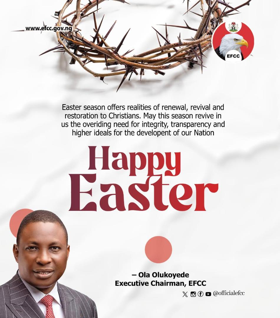 The Executive Chairman of the Economic and Financial Crimes Commission, EFCC, Mr. Ola Olukoyede, rejoices with Christians across the country on the occasion of the death and resurrection of Jesus Christ and charges them to use the lessons of the Easter season to rededicate themselves to the values and virtues of zero corruption.