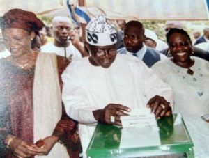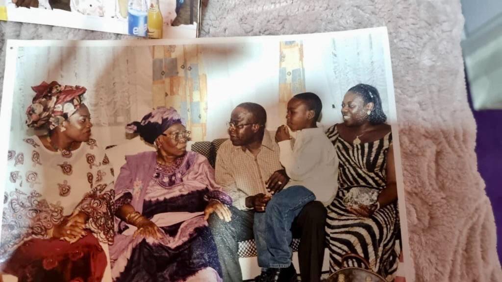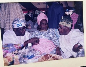 L-R Late Chief (Mrs) Abiodun Kasunmu, President Bola Tinubu’s immediate younger sister and mother to Hon Adedamola R Kasunmu, Deputy Majority Leader, Lagos State House of Assembly, the late Mother of the President and my Aunt, Alhaja Abibat Ashabi Mogaji, President Bola Tinubu, carrying my son, his nephew on his laps, Nazir Edwin-Brown, and that’s me in Ankara Print.
