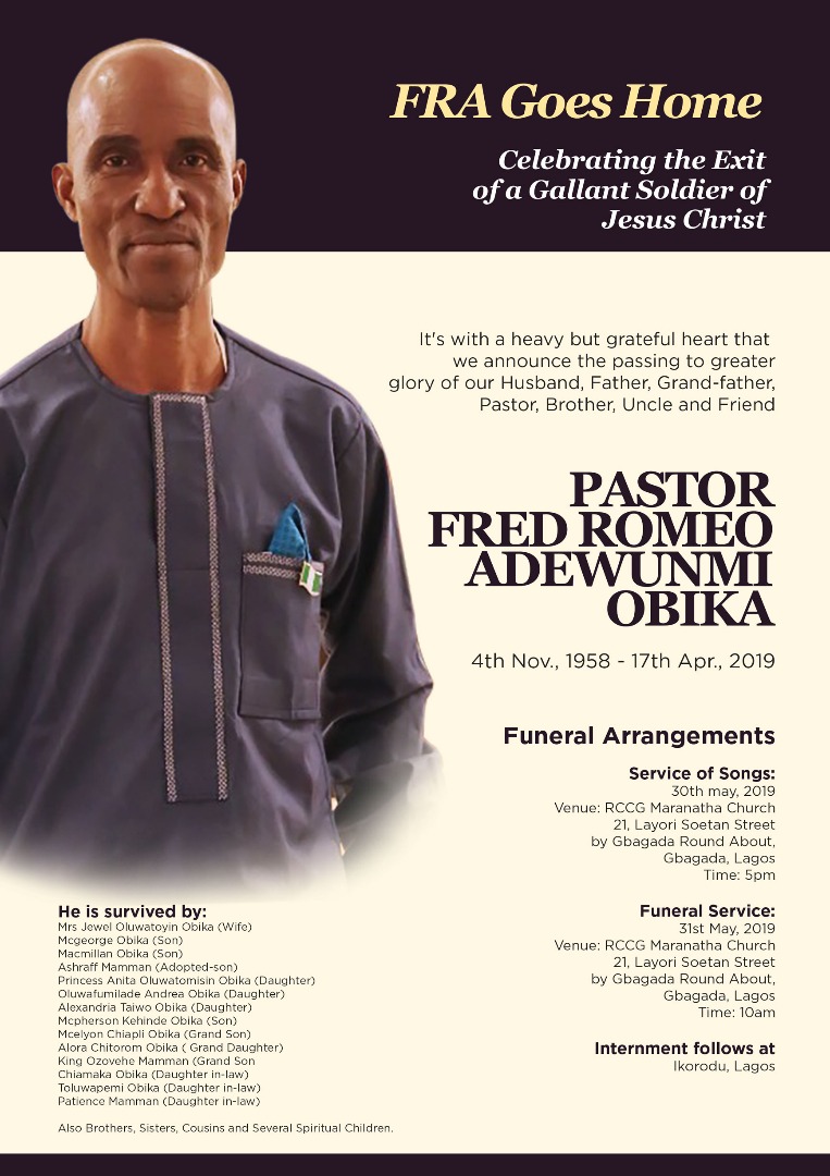 The remains of renowned journalist and Pastor of the Redeemed Christian Church of God, Fred Adewunmi Romeo Obika, will be committed to mother earth on Friday, May 31, 2019.