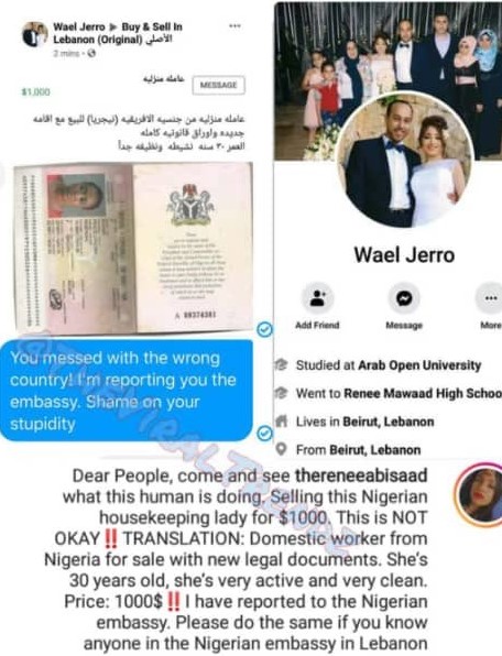 Outrage as Lebanese advertises Nigerian woman for sale on Facebook