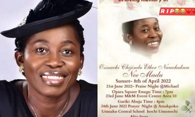 The remains of late gospel singer, Osinachi Nwachukwu, will be buried on Saturday, June 25, 2022, in Abia State. This development was announced on an obituary...