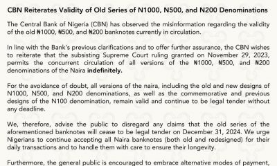 The Central Bank of Nigeria (CBN) has reiterated that the old series of N1000, N500, and N200 denominations remain valid and legal tender, contrary to misinformation...
