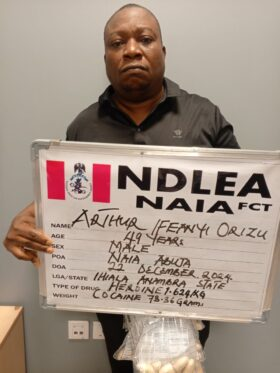 Operatives of the National Drug Law Enforcement Agency have arrested a 48-year-old businessman, Ifeanyi Orizu for ingesting 74 wraps of heroin and cocaine.