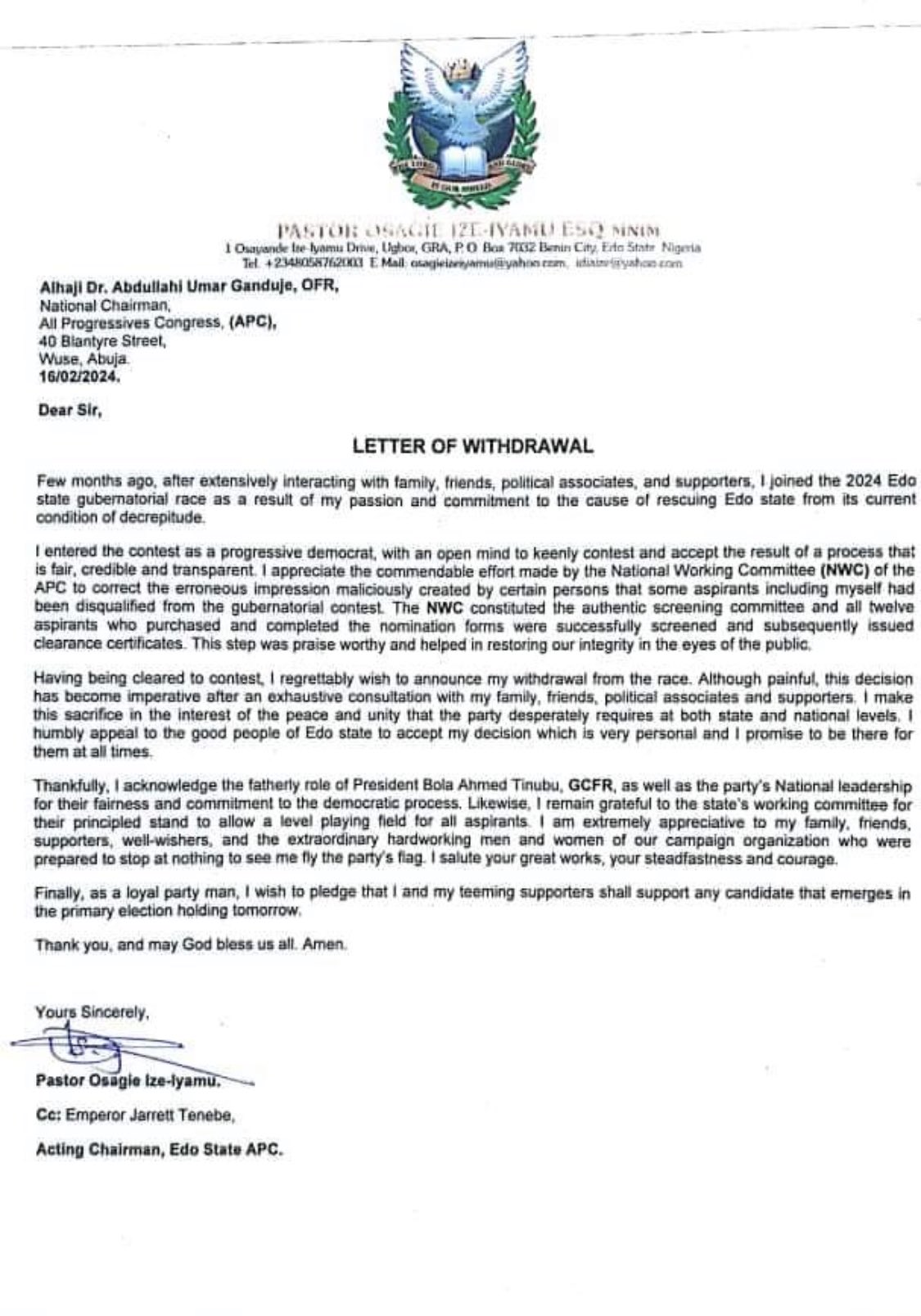 A frontline Edo State governorship aspirant on the platform of the All Progressives Congress (APC), Pastor Osagie Ize-Iyamu has announced his withdrawal from contesting Edo gubernatorial election.