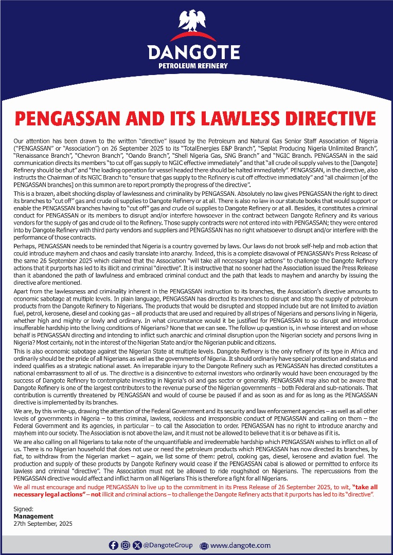 Calling on the Federal Government and security agencies to act swiftly, the refinery urged Nigerians to take note of the “unquantifiable and irredeemable hardship which PENGASSAN wishes to inflict on all of us” if not checked, warning that fuel queues, energy shortages and price hikes could quickly resurface.