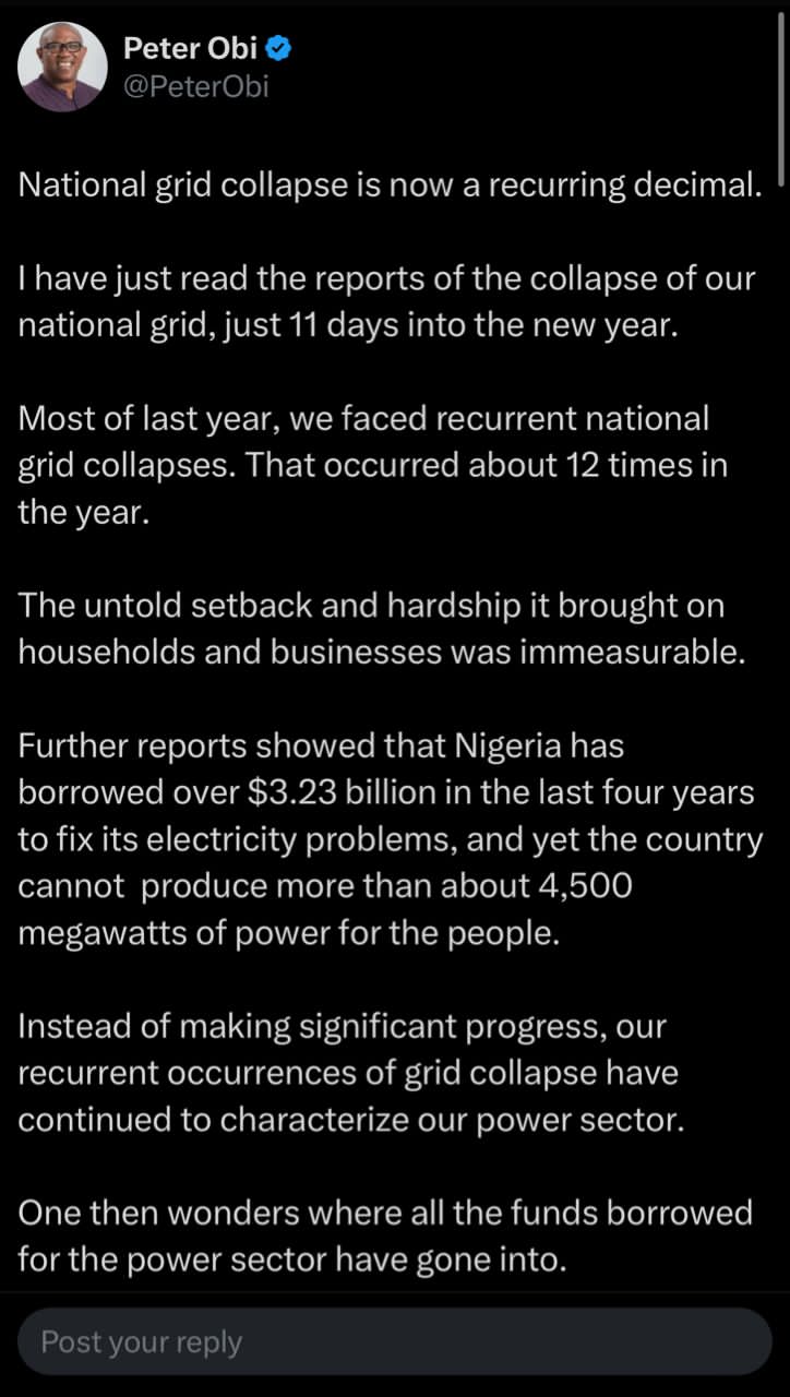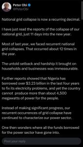 “Despite borrowing over $3.23 billion in the last four years to fix its electricity problems, the recurrent occurrences of grid collapse have continued to mar the nation’s power sector,” Obi said in his initial statement.