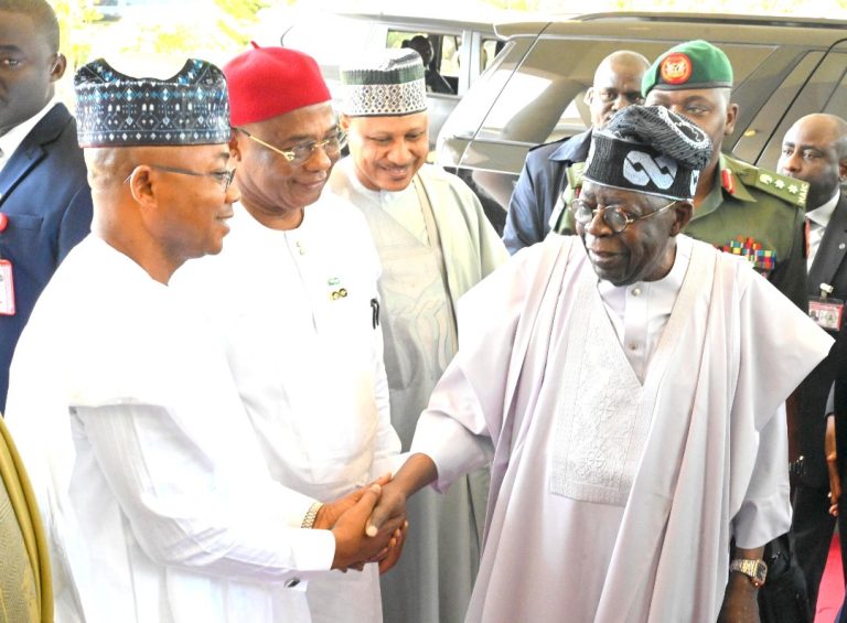 Kogi State Governor, Ahmed Usman Ododo, in a handshake with President Bola Ahmed Tinubu at the All Nigeria 21st Nigerian Guild of Editors’ Annual Conference, State House, Abuja. Governor Hope Uzodinma of Imo State and Minister of Information and National Orientation, Mohammed Idris, watch. Wednesday, November 12, 2025