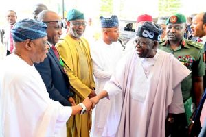 Former Governor of Ogun state Chief Segun Osoba, in a handshake with President Bola Ahmed Tinubu as President of Nigerian Guild of Editors, Eze Anaba, Minister of Solid Minerals, Dr Dele Alake, Kogi State Governor, Ahmed Usman Ododo, wait for their turn at the All Nigeria 21st Nigerian Guild of Editors’ Annual Conference, at the State House Conference Centre, Abuja. Wednesday, November 12, 2025