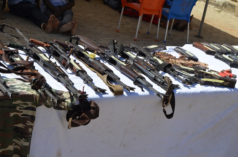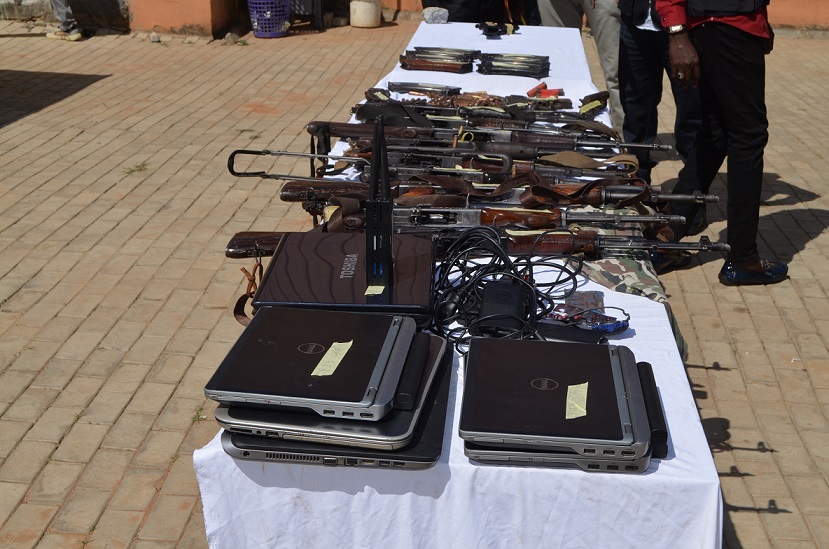 Exhibits recovered from the suspects include: 8 AK49 rifles,1 Beretta Pistol with 6 rounds of live ammunition, 3 locally made pistols, 111 rounds of AK47 ammunition,10 AK47 magazine, 5 live cartridges,7 Laptop computers, 1 anti-tracking device,1 camouflage vest, 8 stolen but recovered vehicles, 1 stolen but recovered trailer truck (Mercedes Actros with reg. no. NNK 334 YT).