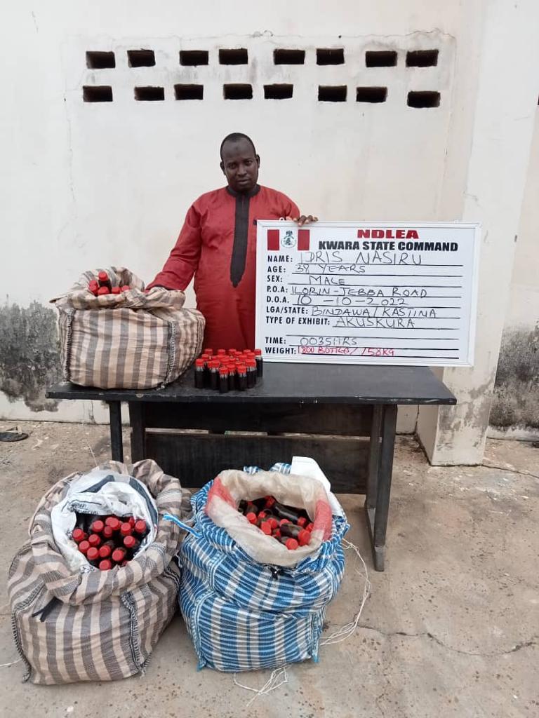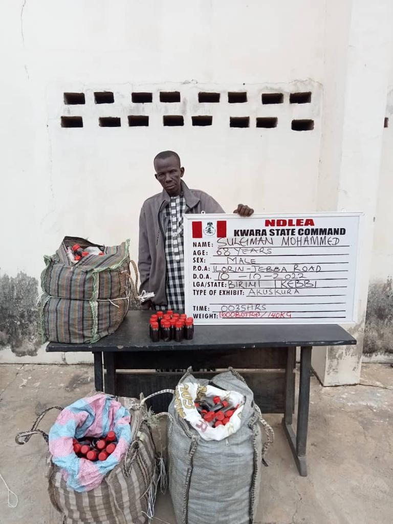 At least, 5,480 pills of tramadol were seized from two suspects: Dalhatu Salisu and Hamisu Ishaq, who were arrested on Wednesday 12th October by operatives along Abuja-Kaduna express road, while a total of 3,800 bottles of new psychoactive substance, Akuskura and 7,760 tablets of tramadol were recovered from five suspects along Ilorin-Jebba highway. Four of the suspects: Idris Nadir, 38; Suleiman Mubammed, 68; Babangida Zaki, 30 and Yahaya Lawal claimed they were coming from Ibadan, Oyo state and taking the Akuskura to Katsina, Kano and Birnin Kebbi. The fifth suspect, Nafiu Idris, who was arrested with the tramadol pills said he was taking them to Kankara in Katsina state.