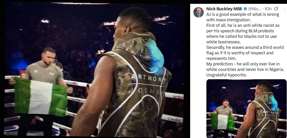 The controversy was triggered by Nick Buckley MBE, a far-right commentator, who derided Joshua’s gesture as “migrant ingratitude”—a remark that instantly drew widespread condemnation and accusations of racial prejudice. Social media platforms were flooded with messages of support for the former world heavyweight champion, as Nigerians at home and abroad rallied to defend his right to honour his heritage.