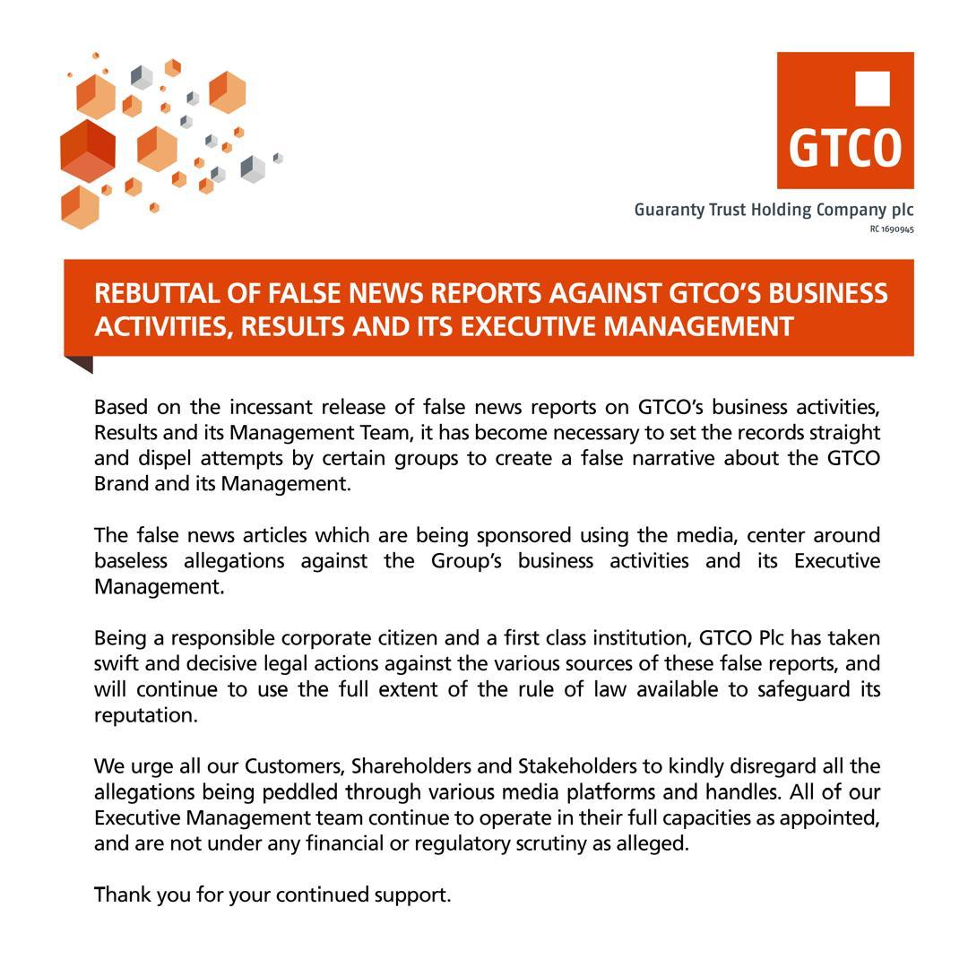 Based on the incessant release of false news reports on GTCO’s business activities, Results and its Management Team, it has become necessary to set the records straight and dispel attempts by certain groups to create a false narrative about the GTCO Brand and its Management.