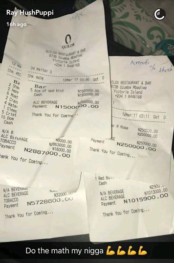 Hushpuppi as he’s popularly known by posted the receipt amounting to a total of N11,381,700. As the receipt hit Snapchat it started making rounds on Twitter, with many in awe as to how one man could blow that much money in one night.