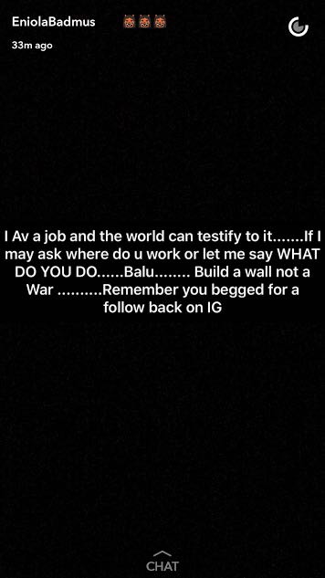 Popular actress Eniola Badmus known as “gbogbo big girl” took to her Snapchat to question the source of Hushpuppi’s wealth. In her post she wrote “I av a job and the world can testify to it. If I may ask where do you work or let me say WHAT DO YOU DO. Balu. Build a wall not a War. Remember you begged for a follow back on IG.”