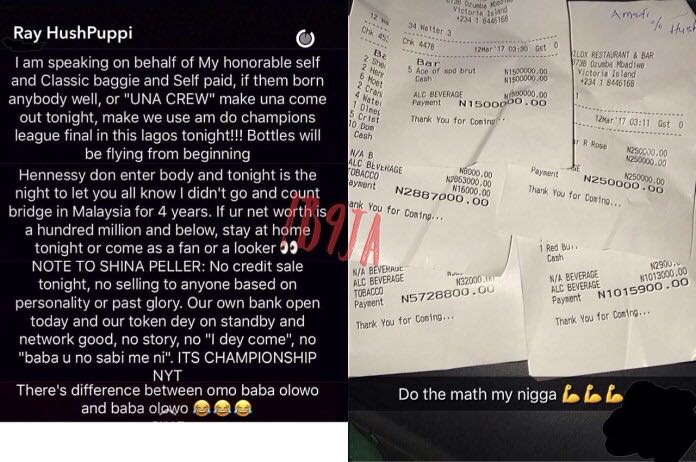 The social media space went wild last weekend when Nigerian-Malaysian top socialite “Ray Hushpuppi” posted a picture of his receipt of his expense at Lagos biggest night club “Quilox.”