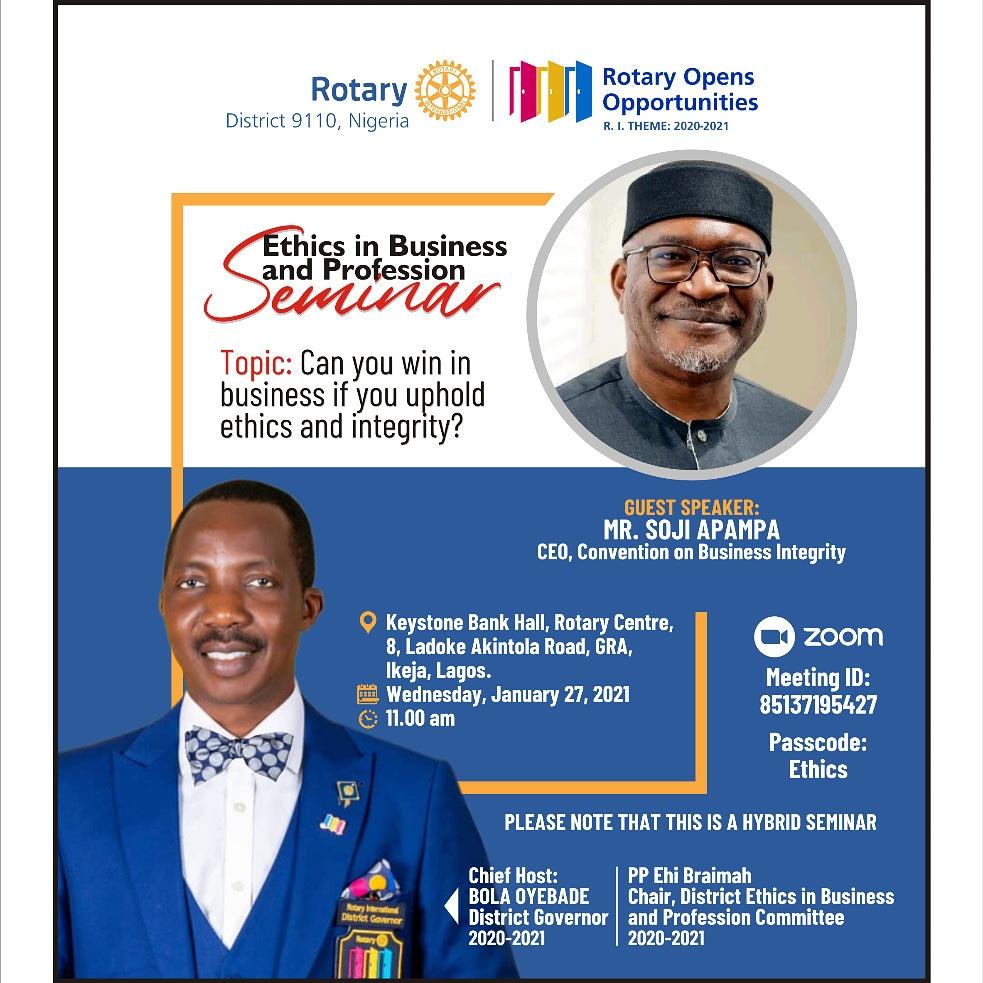 The Rotary International District 9110 that covers clubs in Lagos and Ogun State is set to host its annual Ethics in Business and Profession Seminar.