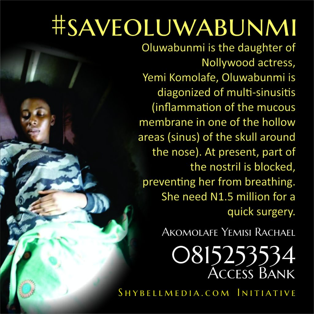 #saveoluwabunmi : Nollywood Actress, Yemi Komolafe’s Daughter, Oluwabunmi Seriously ill, Needs N1.5M for Surgery