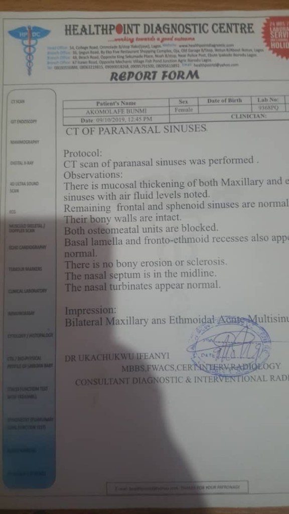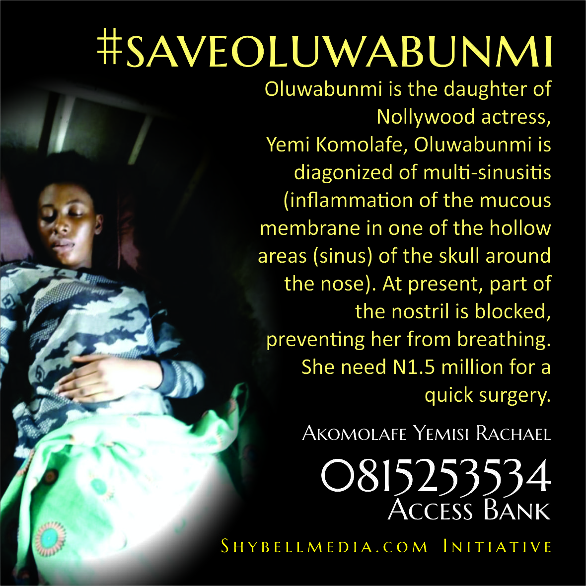 According to Shybellmedia.com research and results, Nollywood’s actress, Yemi Komolafe’s daughter, Oluwabunmi Komolafe, was diagonized of multi-sinusitis (inflammation of the mucous membrane in one of the hollow areas (sinus) of the skull around the nose) seven months ago.