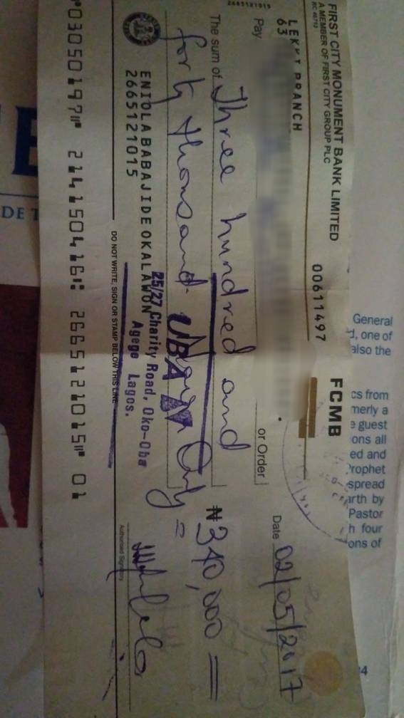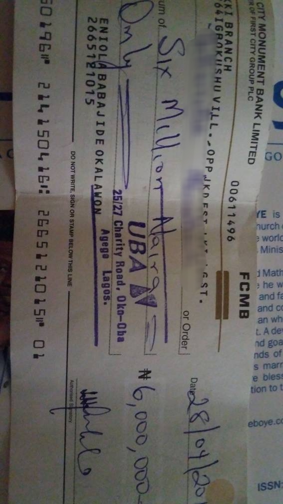 “He gave me an FCMB cheque of N6 Million and another N340,000 cheque before he left Nigeria and told me to give someone N100,000 from the second cheque. These were supposed to be repayment of the loans he collected from me while in Nigeria. The cheque ought to mature a week after he left, but the two cheques bounced.