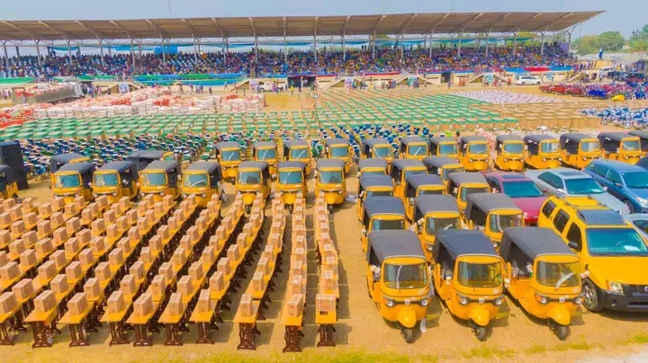 Photo caption: Last December, Senate President Godswill Akpabio distributed cars, tricycles, mini vans, sewing machines, tractors, and other empowerment tools to his constituents—a tradition among Nigerian legislators aimed at poverty alleviation and grassroots support.