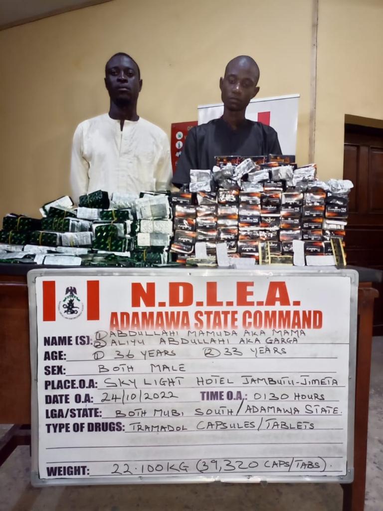 In Adamawa state, operatives arrested two trans-border traffickers, Abdullahi Mamuda (aka Mama) and Aliyu Abdullahi (aka Garga) at Skylight Hotel in Jambutu, Yola North. A search of their vehicle, an ash coloured Toyota Corolla car with registration number JMT 146 TE (Adamawa), revealed 39, 320 tablets of Tramadol 225mg concealed in different compartments of the doors of the car.