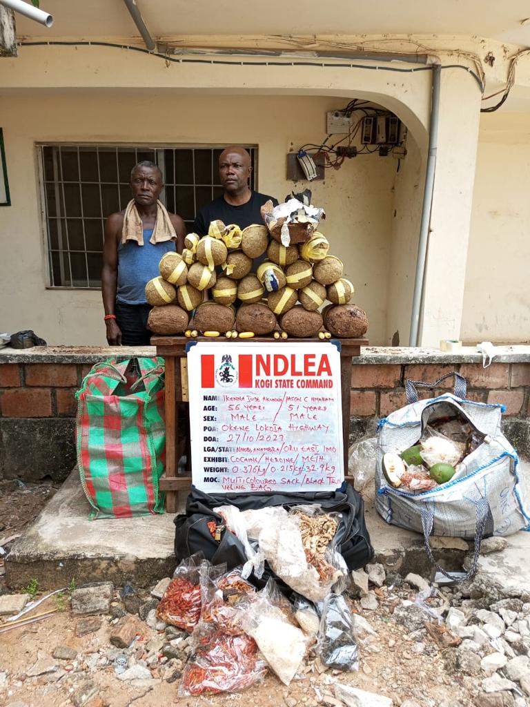 In Kogi state, NDLEA operatives on stop and search operation along Okene-Abuja highway on Thursday 27th Oct intercepted a Chisco branded bus coming from Lagos to Abuja with a consignment of 32.9kgs Meth packaged as tubers of yam; 376 grams of cocaine and 215 grams of heroin. While the bus driver, Chief Pascal Chigozie Nmaram was promptly arrested, a follow up operation in Abuja same day led to the arrest of the recipient of the illicit cargo, Mr. Ikenna Jude Akunne who confessed he was detailed to travel with the consignment to Spain the following day, Friday 28th Oct through the Nnamdi Azikiwe International Airport Abuja. Meanwhile, operatives of the state command of the Agency have destroyed five hectares of cannabis farms at Agbonkete, Iyaya Camp, Igalamela/Odolu LGA, where a suspect, Augustine Agbenyo, 34, was arrested with three sacks of both fresh and dried leaves and stems of the illicit substance.