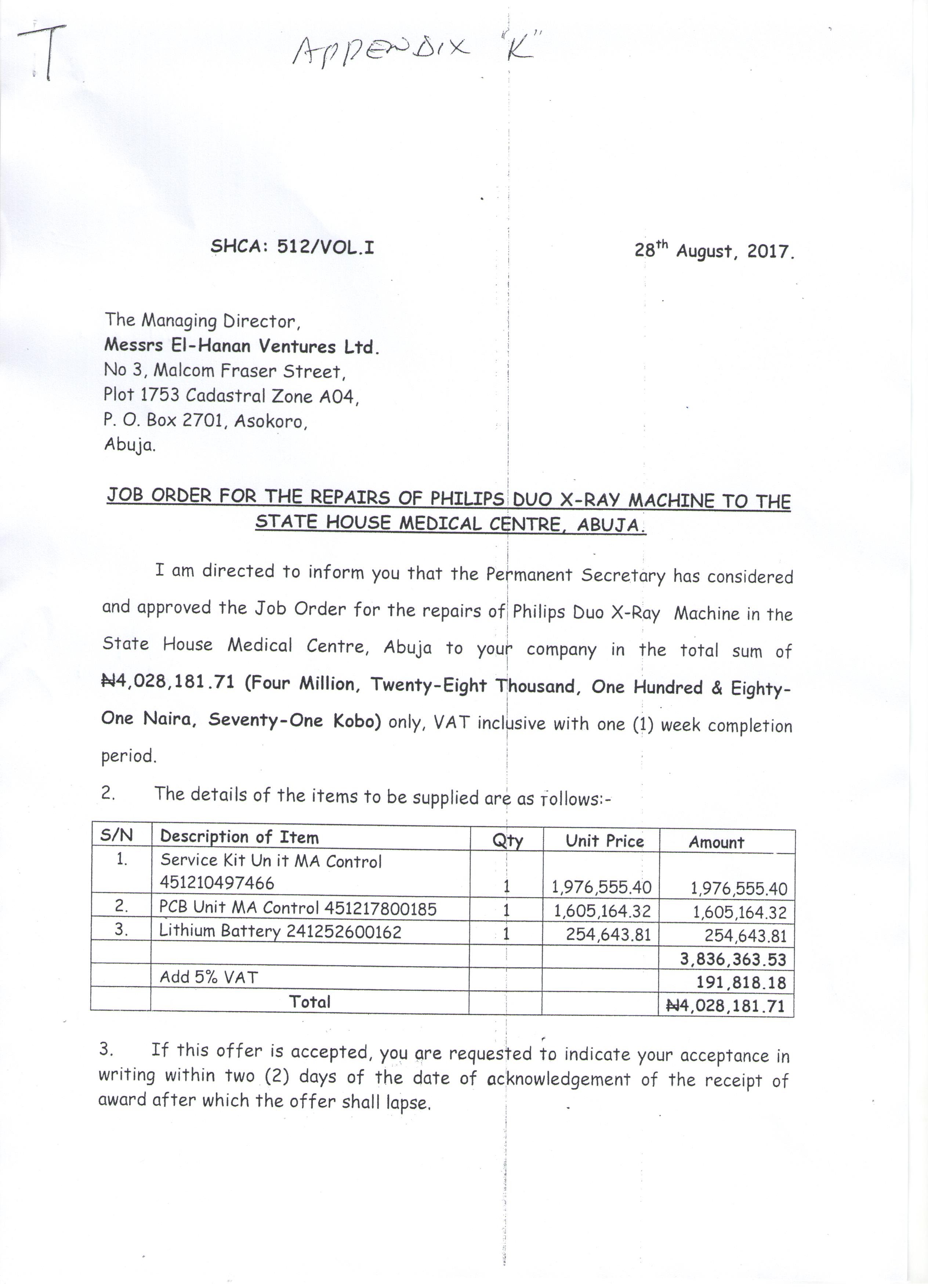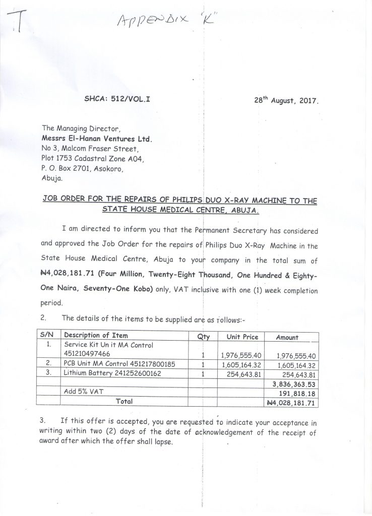 However, a letter, which indicated the job order for the repairs of Philips Duo X-Ray Machine to the State House Medical Centre, Abuja and signed by one Ilesanmi O.I on behalf of the Permanent Secretary of the State House was also obtained by this magazine.