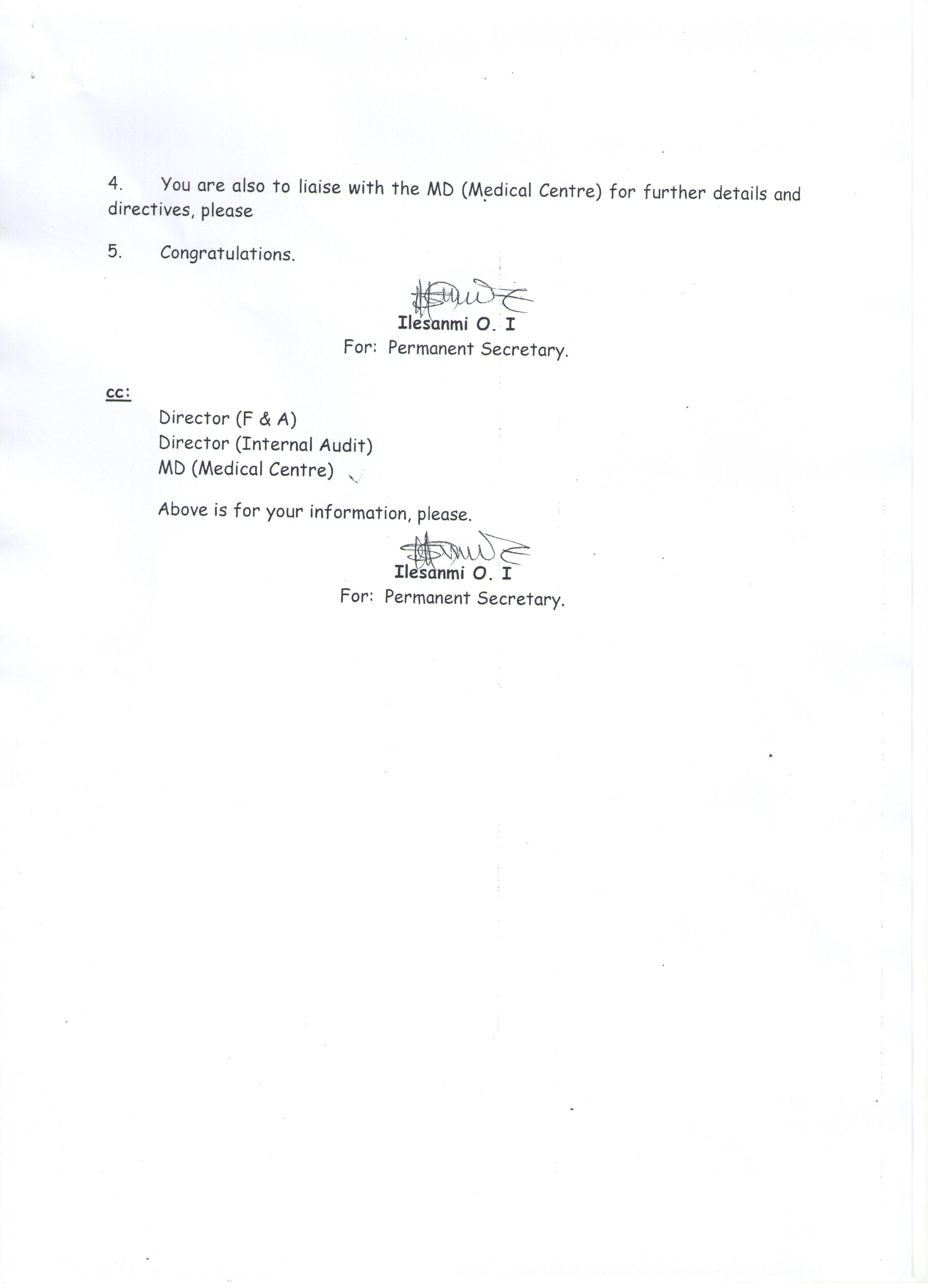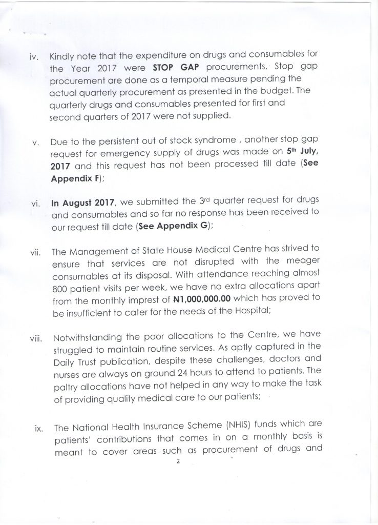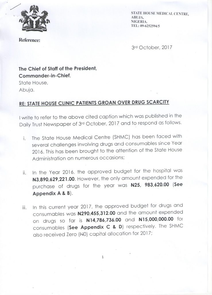 Damning allegations were made against the Permanent Secretary in a letter signed by the Medical Director of the Clinic, Dr. H.Y Munir and addressed to the Chief of Staff to The President, Commander-in-Chief, State House, Abuja, dated 3rd October, 2017.