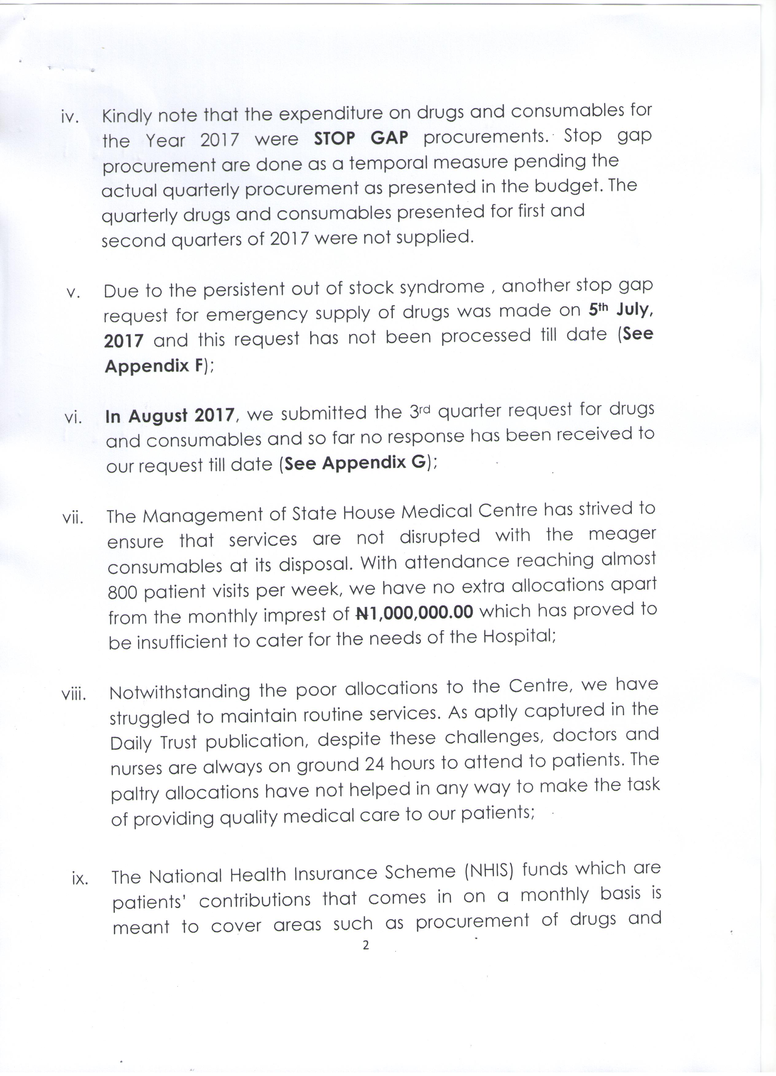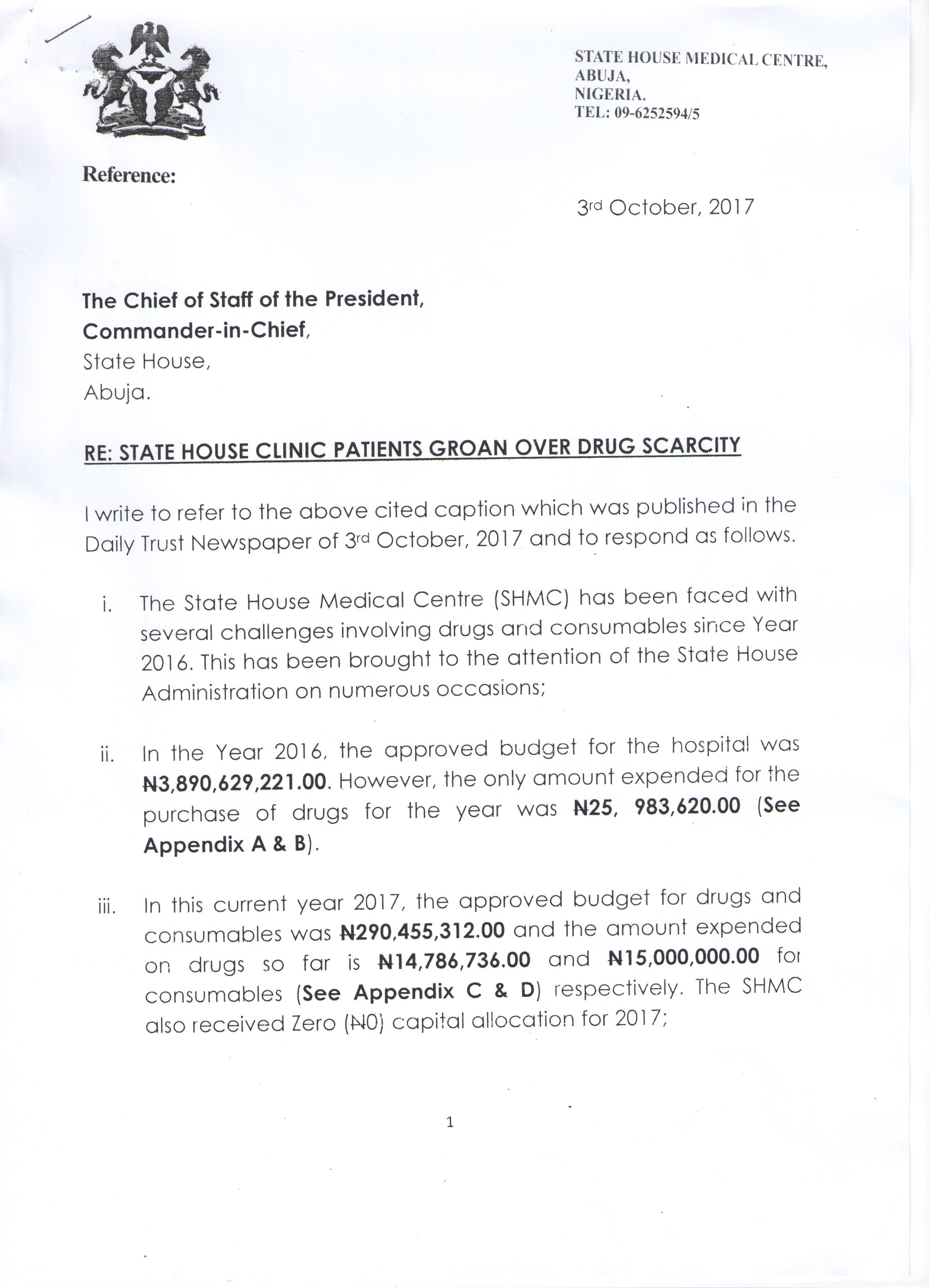 The letter, which was obtained by this magazine, was titled; “Re-State House Clinic Patients Groan Over Drug Scarcity.”