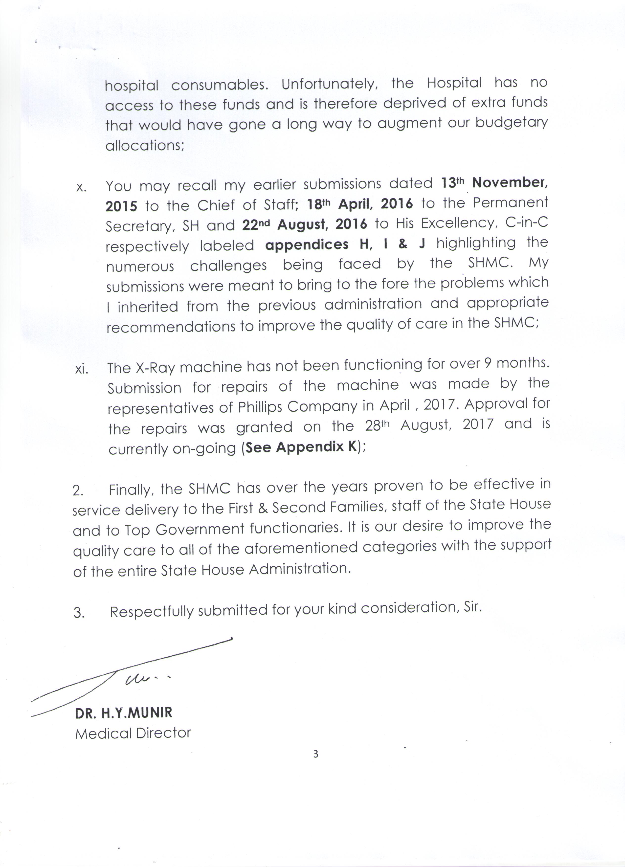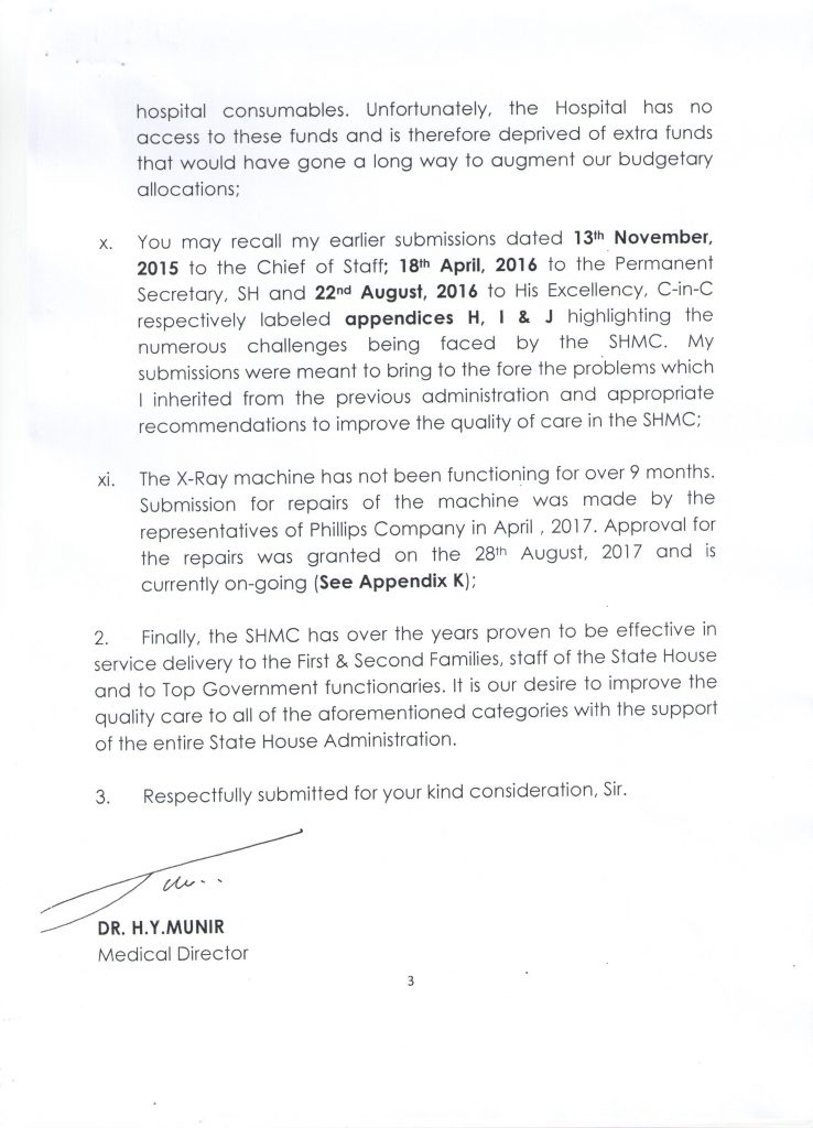 Munir said in the letter that the State House Medical Centre (SHMC) has been faced with several challenges involving drugs and consumables since Year 2016, and that this has been brought to the attention of State House Administration on numerous occasions.