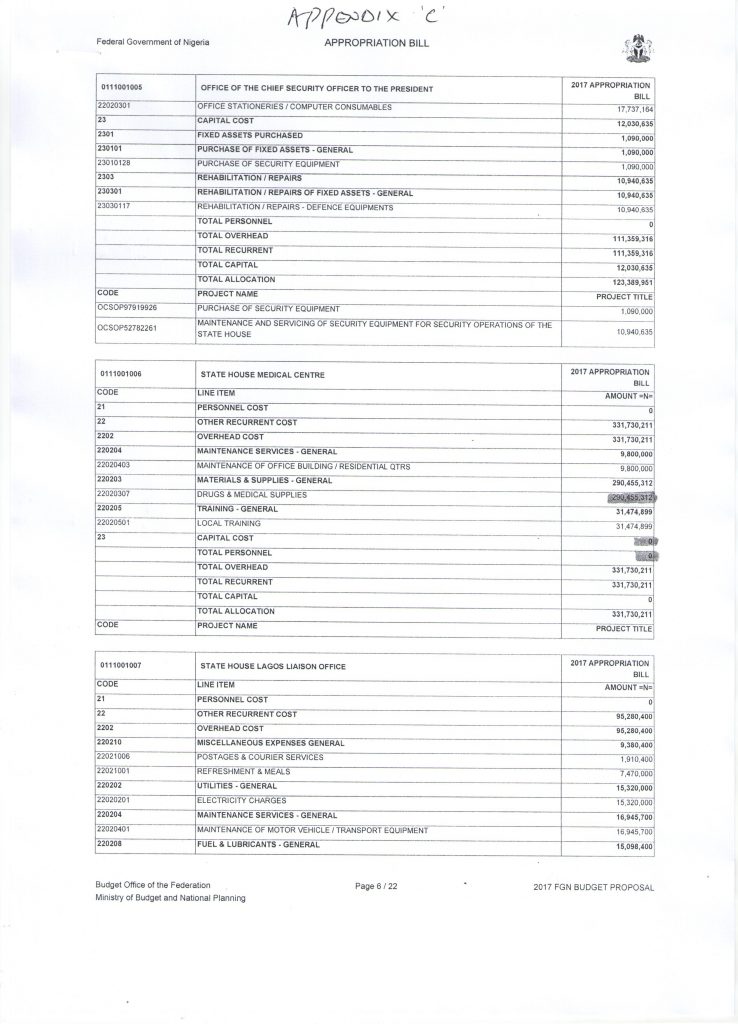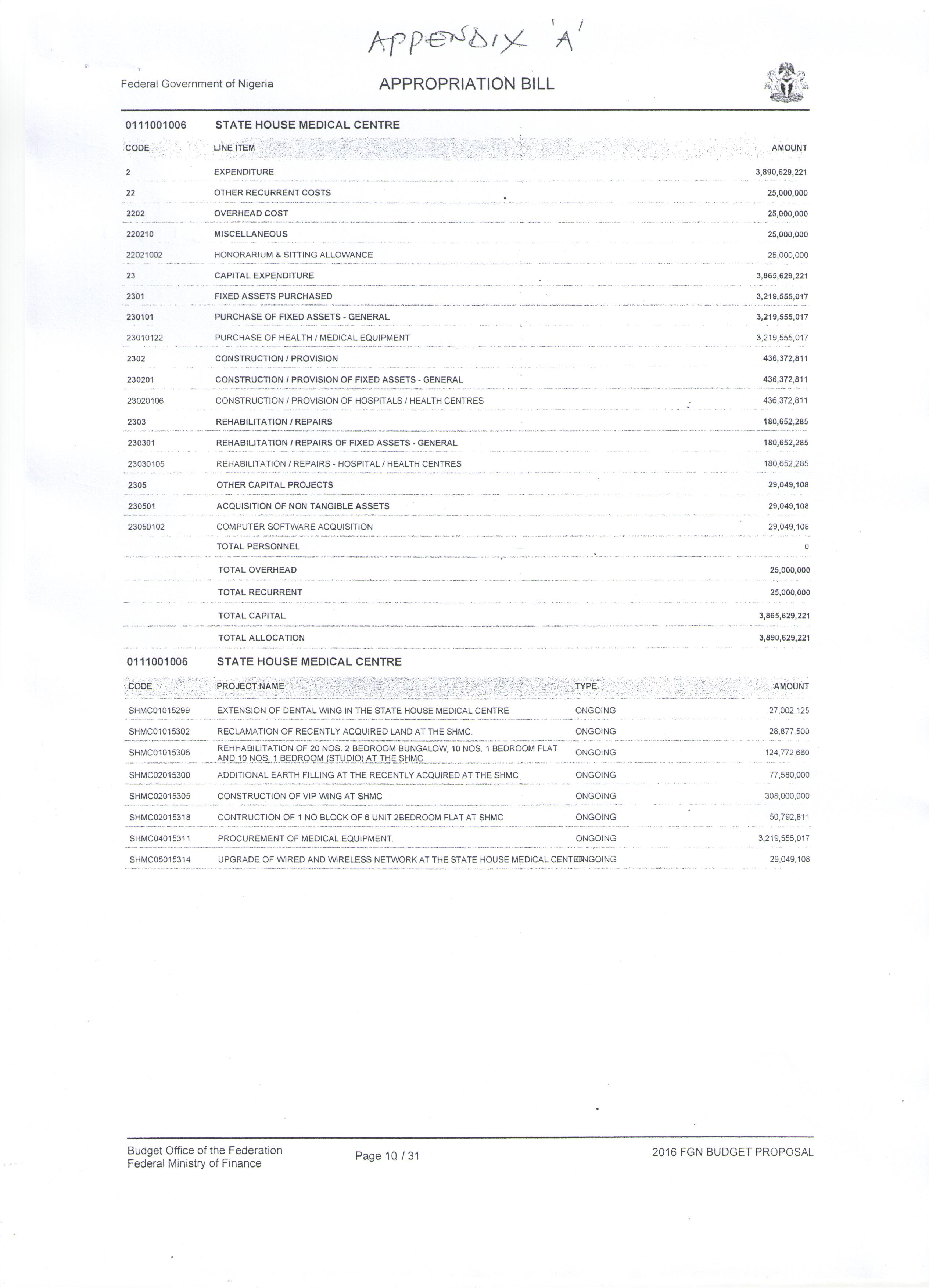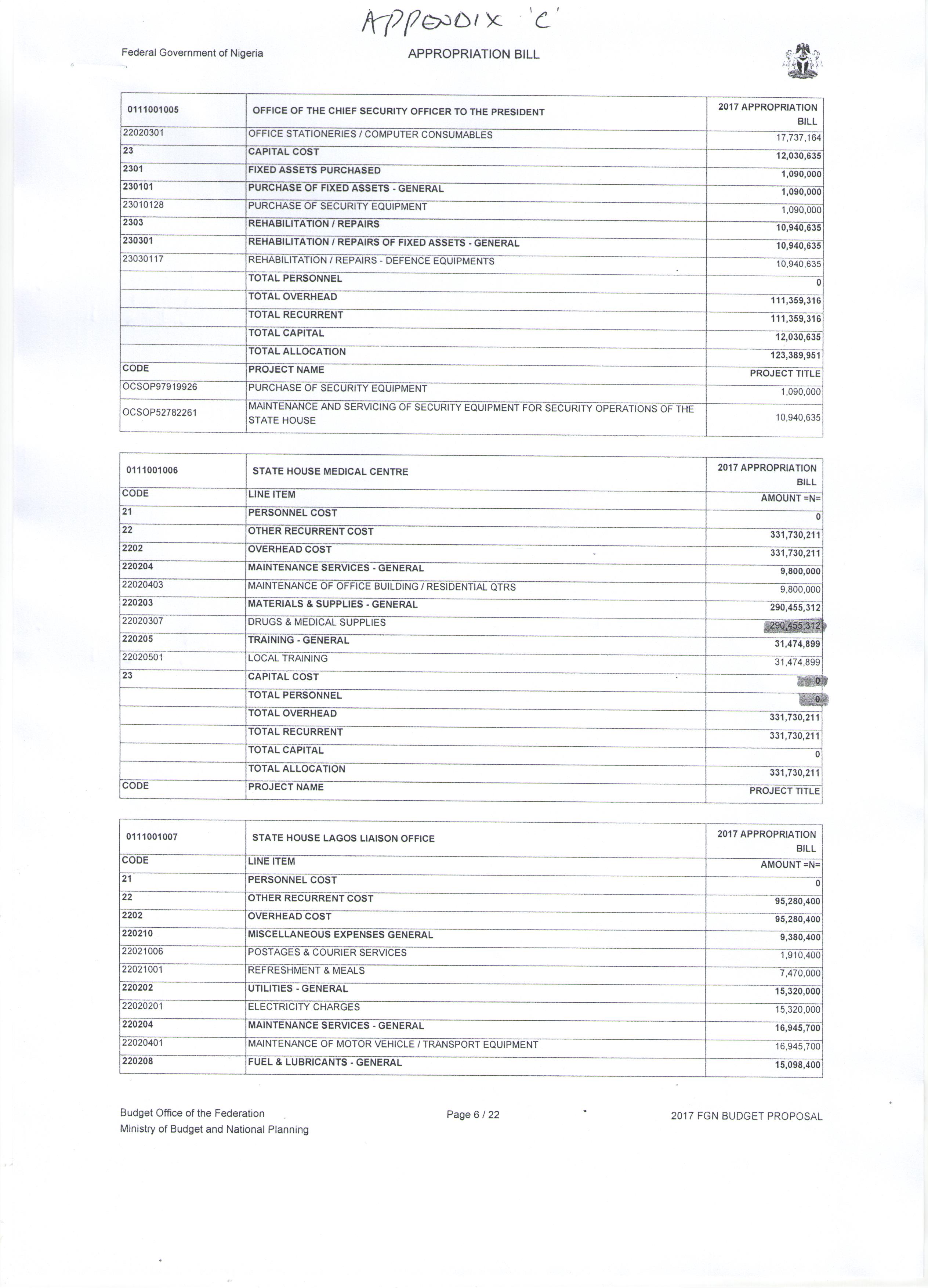 Still on the Aso Rock Clinic, we were able to obtain documents detailing the approved budget for provision of facilities in the hospital, but which were not provided.