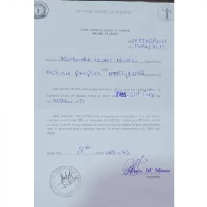 Barring any unforeseen circumstances, the Supreme Court will hear the motion of the Peoples Democratic Party and Action Peoples Party respectively which applied to the apex Court to give effect to its judgment delivered on December 20, 2019, disqualifying Uche Nwosu from the Imo governorship election on the ground of double nomination on Tuesday, October 31st, 2023.