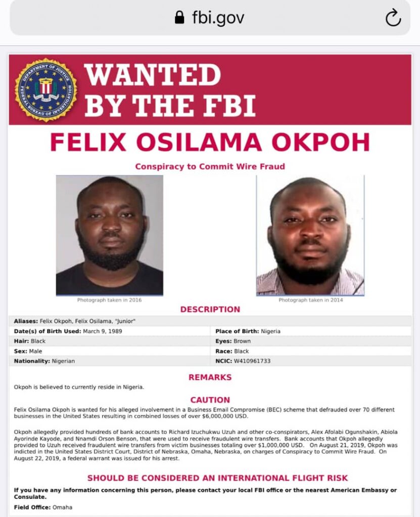 Okpoh, alongside Richard Izuchukwu Uzuh, Alex Afolabi Ogunshakin, Abiola Ayorinde Kayode and Nnamdi Orson Benson was declared wanted by the FBI sometime in 2019 for his alleged involvement in a Business Email Compromise, BEC, scheme that defrauded over 70 different businesses in the United States resulting in combined losses of over $6,000,000 USD.