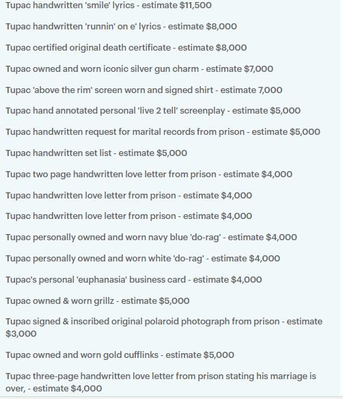 All the items of the rapper who was shot dead in Las Vegas in 1996 are set to fetch a total of around $320,000.