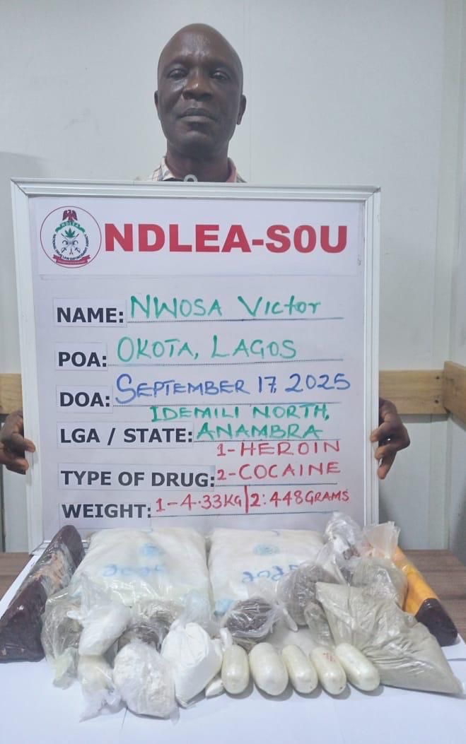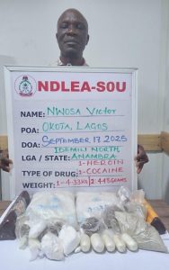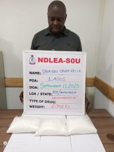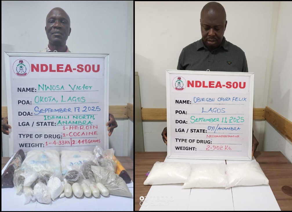 At the time they were preparing their consignments for export, NDLEA-SOU operatives who have for months put them under surveillance, swooped on them in different parts of Lagos. Nwosa was arrested on Wednesday 17th September 2025 at his 16 Femi Kila street, Okota home where 4.33 kilograms of heroin and 448 grams of cocaine were recovered during a search of his house. In his case, Obiegbu was arrested on Thursday 11th September at his 5 Shada Shonefun street, Aguda Surulere home where in the course of a search, 2.902 kilograms of methamphetamine were uncovered and seized.