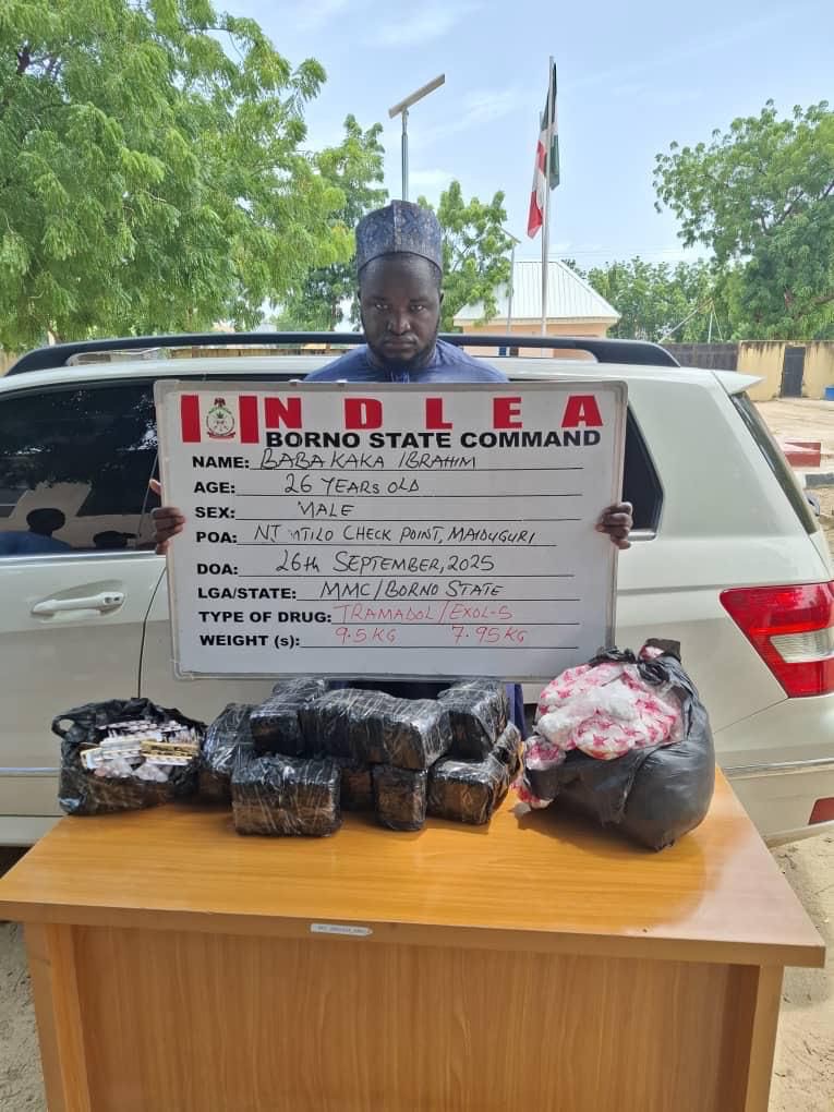 In Borno, following weeks of intelligence, NDLEA officers on Saturday 27th September arrested Baba Kaka Ibrahim, 26, at Njimtilo village while driving a Mercedes Benz GLK marked JRE 987 AE towards Damaturu road. A search of the vehicle led to the recovery of 39, 380 pills of tramadol 225mg and exol-5 stuffed in the engine compartment of the jeep.