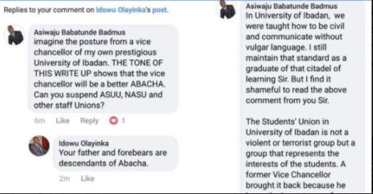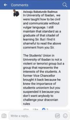 He wrote: “Imagine the posture from a vice chancellor of my own prestigious University of Ibadan. THE TONE OF THIS WRITE UP shows that the vice chancellor will be a better ABACHA. Can you suspend ASUU, NASU and other staff unions?”