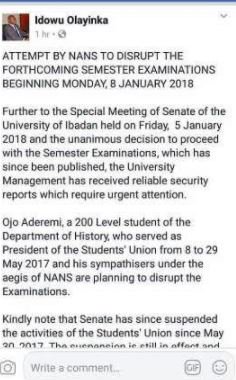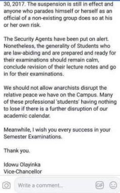 The post titled “ATTEMPT BY NANS TO DISRUPT THE FORTHCOMING SEMESTER EXAMINATIONS BEGINNING MONDAY, 8 JANUARY 2018” has been completely deleted on the VC’s facebook page.