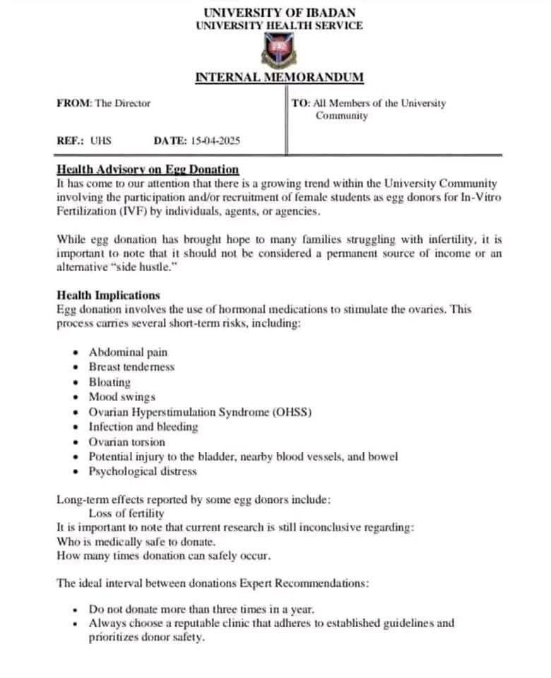 In a recent internal memorandum dated April 15, 2025, the University Health Service of the University of Ibadan has sounded a strong advisory to all members of its academic community over the increasing participation of female students in egg donation programs.