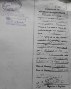 Marriage certificate of new wife