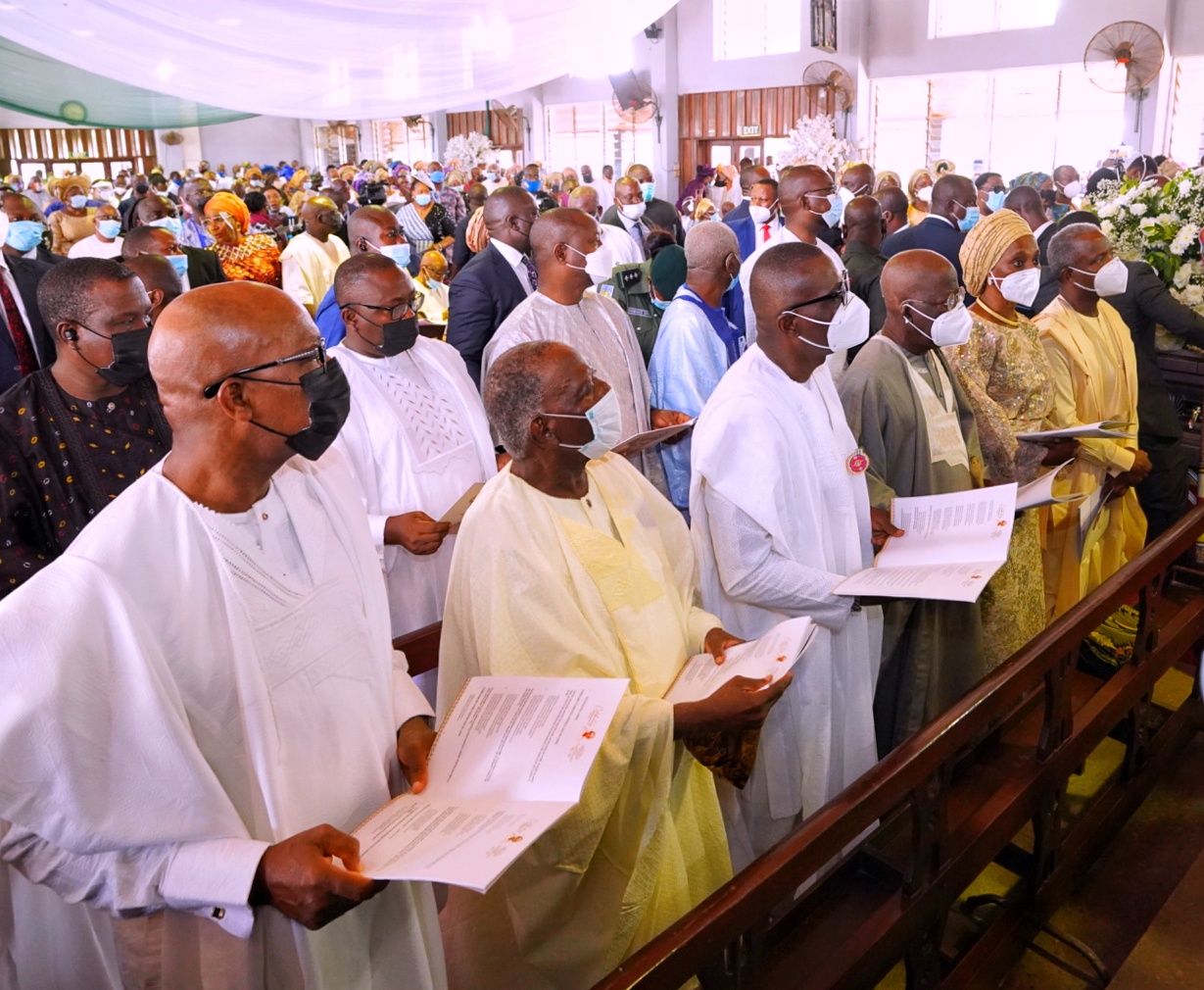 L-R: Ogun State Governor, Prince Dapo Abiodun; former interim National Chairman of APC, Chief Bisi Akande; Lagos State Governor, Mr. Babajide Sanwo-Olu; National Leader of APC, Asiwaju Bola Tinubu; wife of the Vice President, Mrs. Dolapo Osinbajo and Prof. Yemi Osinbajo, during the funeral service of Mrs Olubunmi Oyediran (first daughter of late Chief Obafemi Awolowo), at All Saints Church, Jericho, Ibadan, on Friday, December 4, 2020.